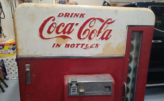 Our customer from Alabama shipped this Vendo 110 to us to restore. The story was this was his father's machine, and at some point, his dad removed all the interior parts, bottle stack, shelves, etc, and used the machine to cool meat.